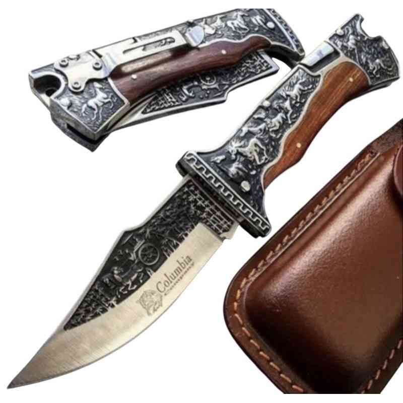 Сгъваем нож джобен+калъф от естествена кожа за колан ловен луксозен